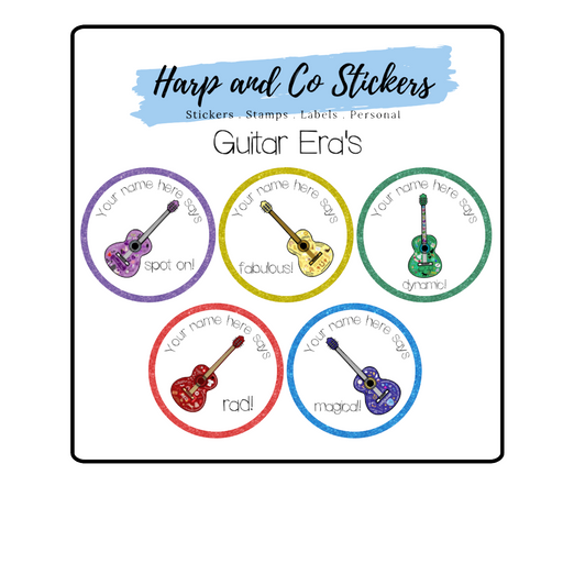 Guitar Era's Stickers Show your love for music with our Guitar Era's stickers! Featuring colourful guitars and fun phrases like "spot on!", "fabulo...