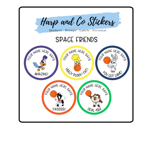 Space Friends Stickers Blast off into fun with our Space Friends stickers! Featuring beloved cartoon characters with their quirky sayings, these st...