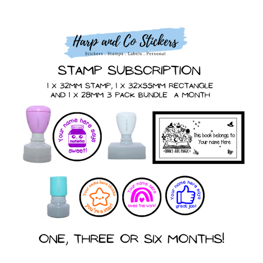 Meet all your Stamp needs each month! 5 Different and Fresh designs each month. You'll get 1 x 32mm pre inked round stamp 1 x 32 x 55mm pre inked r...